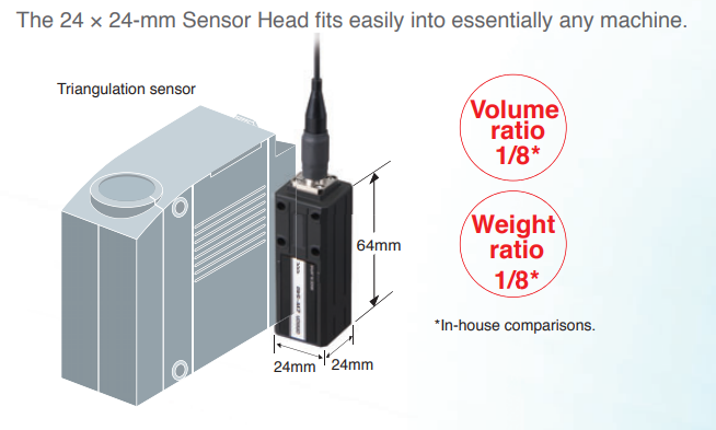 İnce tasarım sadece 24 × 24 mm’dir. Sadece 105 gr ağırlığındadır. Bu inanılmaz kompakt boyut geleneksel lazer deplasman sensörlerinde elde edilemedi. Herhangi bir nesne, onlara dik olarak monte edilen sensör ile ölçülebilir.